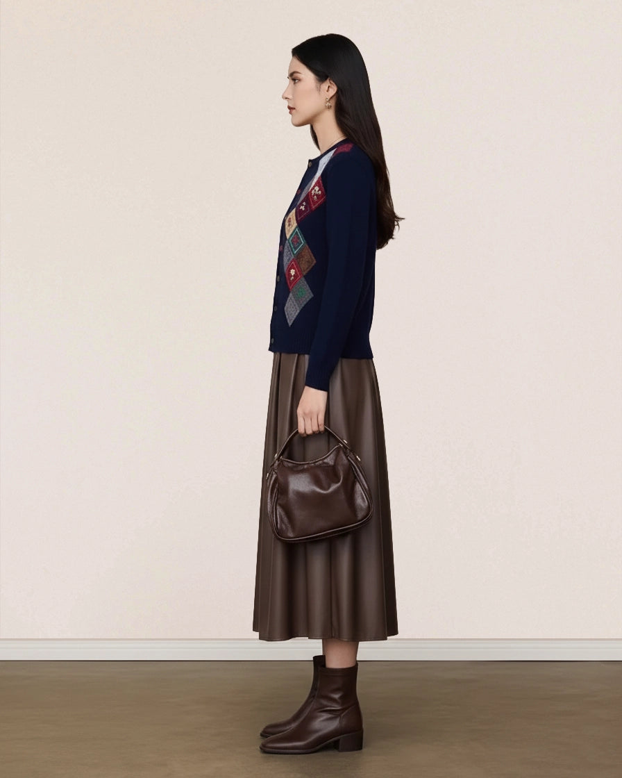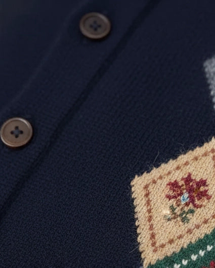 A poetic blend of artisanal craftsmanship and premium fiber. This cardigan features a sophisticated Vintage Floral Intarsia—retro floral motifs blooming amidst interlacing diamonds. Crafted from 100% Superfine Merino Wool, it offers a plush, breathable warmth that rivals the softness of cashmere.